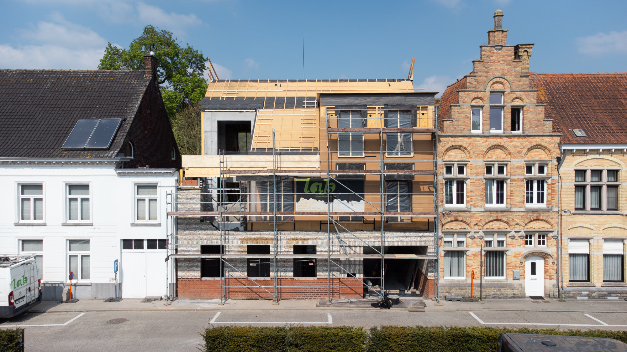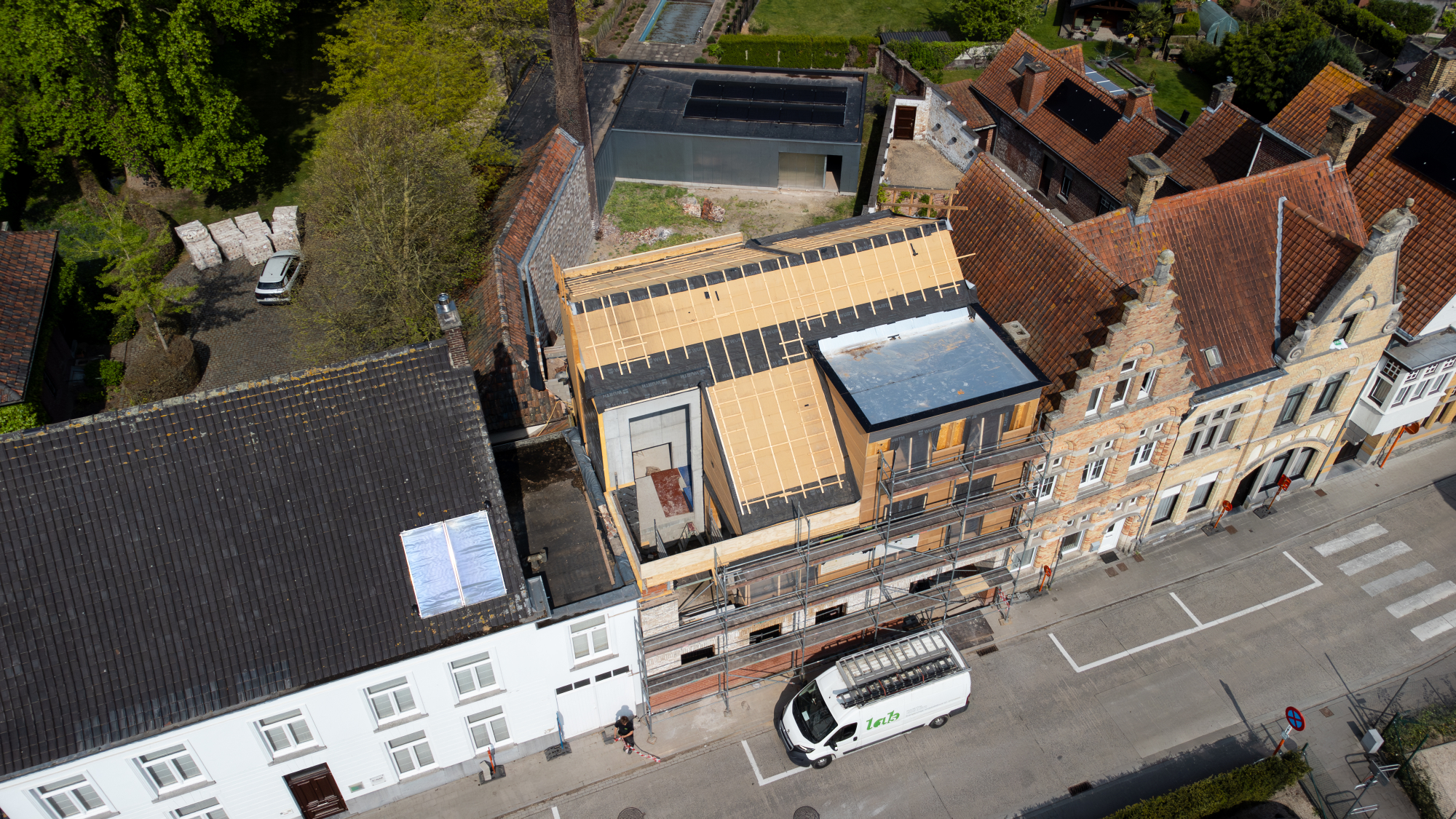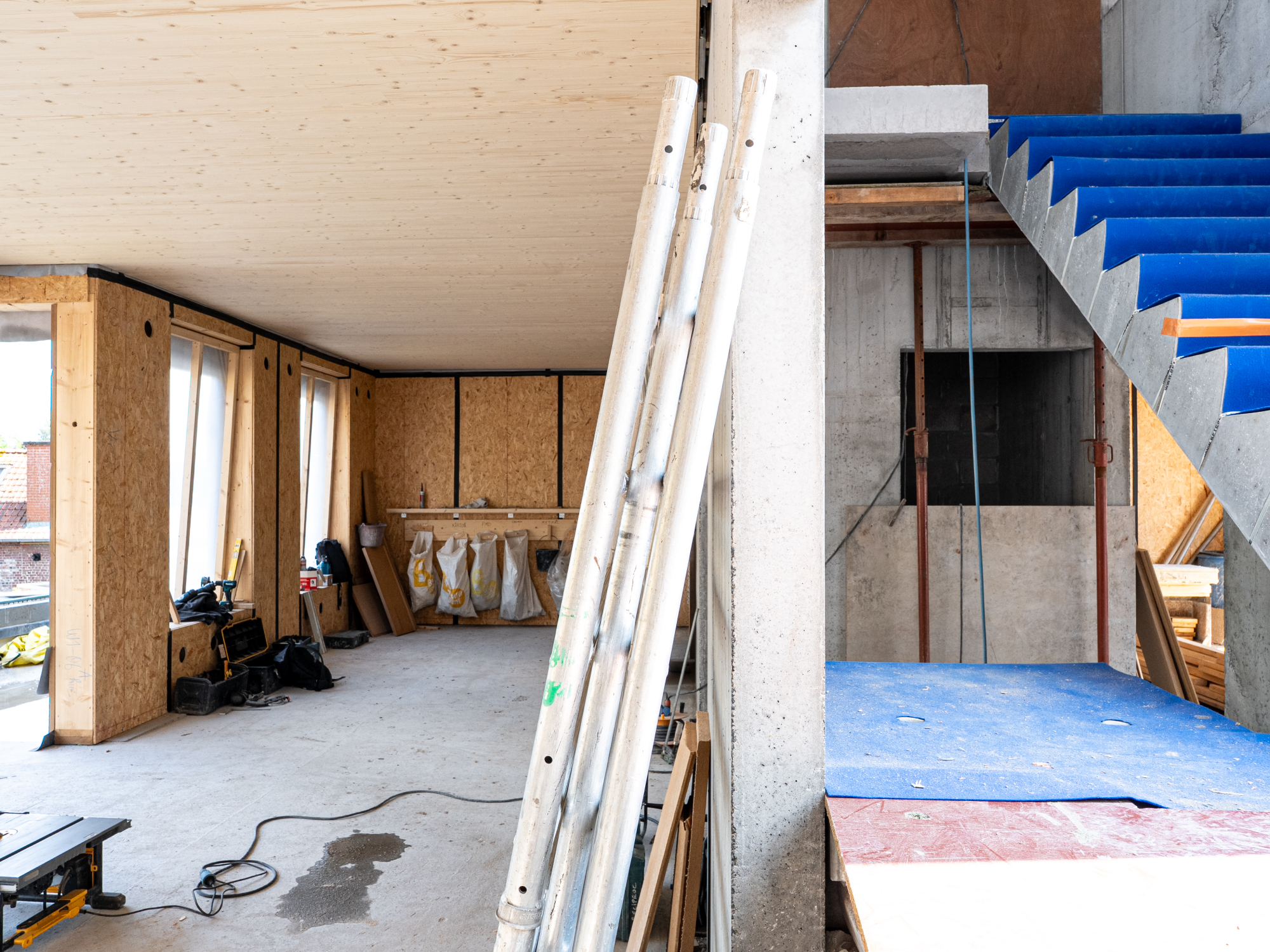 Rond deze kern ontvouwt zich een hybride CLT- en houtskeletstructuur, die warmte binnenbrengt. De speelse organisatie van de ruimtes rond de centrale kern, in combinatie met het inpandig terras aan de straatzijde, creƫert een open en lichtrijke circulatiezone die de verschillende leefruimtes op een natuurlijke manier met elkaar verweeft.