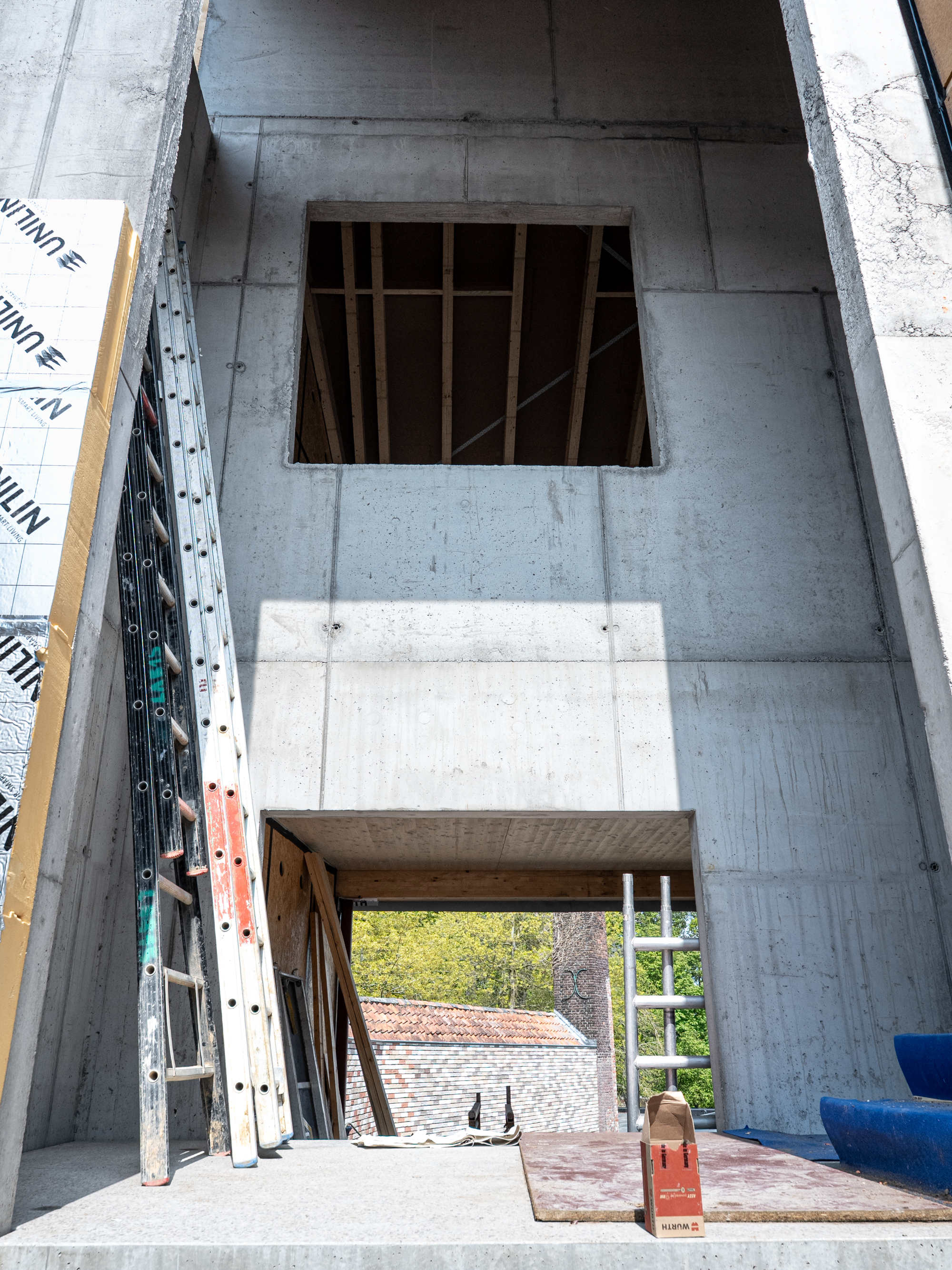 De ruggengraat van dit ontwerp in de Kloosterstraat in Ruiselede is een expressieve circulatiekern in zichtbeton, die niet alleen structureel, maar ook ruimtelijk het hart van de woning vormt.