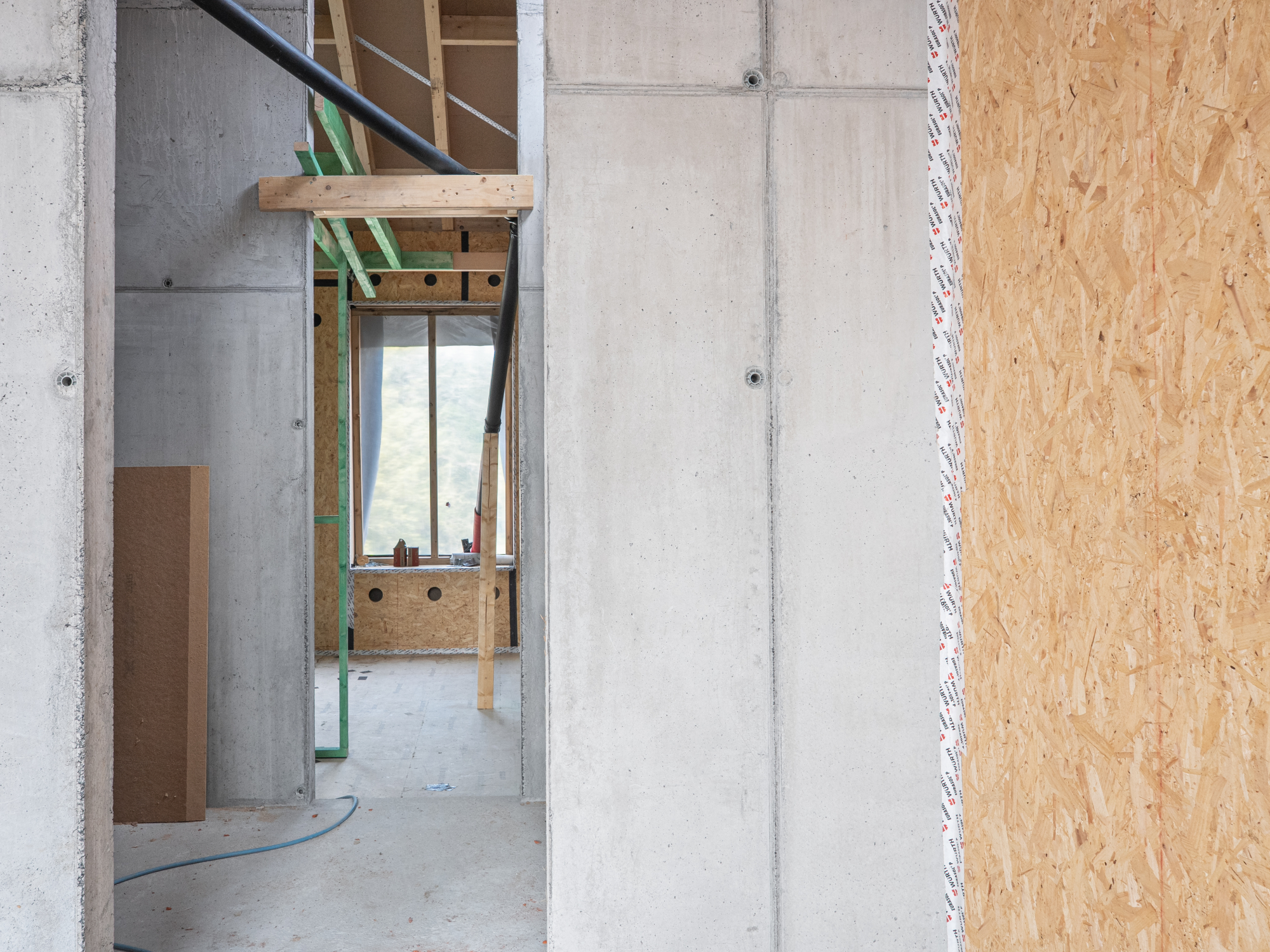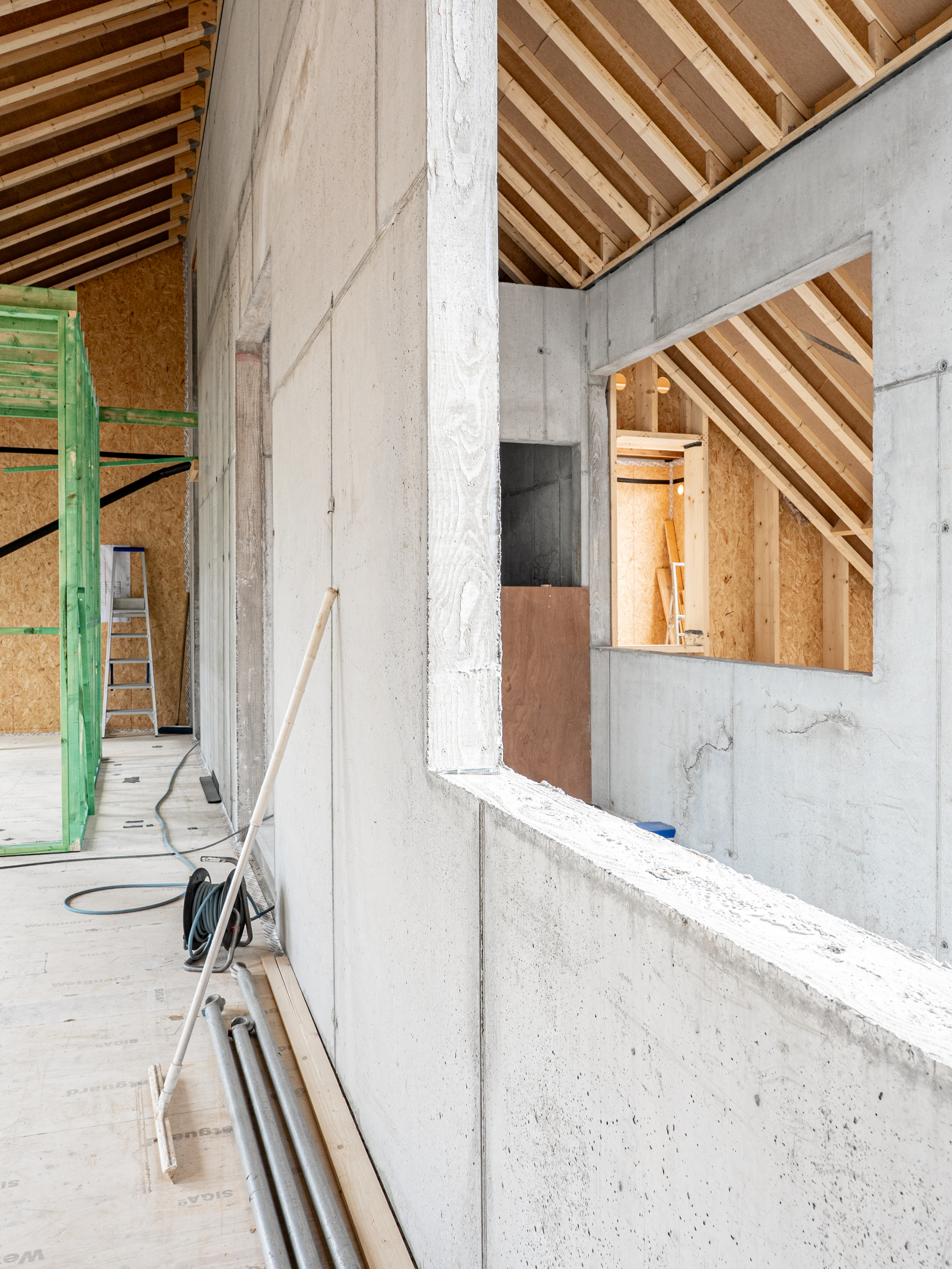Rond deze kern ontvouwt zich een hybride CLT- en houtskeletstructuur, die warmte binnenbrengt. De speelse organisatie van de ruimtes rond de centrale kern, in combinatie met het inpandig terras aan de straatzijde, creƫert een open en lichtrijke circulatiezone die de verschillende leefruimtes op een natuurlijke manier met elkaar verweeft.